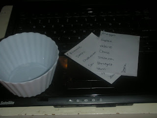 I am sorry I didn't post this last night. I really should've thought about what my Thursday looked like. I hosted Keno at my house last night and after the last gal left at 9:30 it was time to pick up, give the little man a quick kiss and put him to bed, pay bills and then of course, we wanted to watch The Office. We watched Bush's farewell address, fast forwarded through Earl and then....NOTHING! I guess the recorder was set up wrong so I still don't know what happened. Maybe we'll watch it online when hubby comes home for lunch later. After that, he wanted to go to bed early and when I remembered about drawing, he was snoozing away and none of the puppies were any help either.